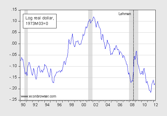 That being said, I think the important variable — that we have control over — is the exchange rate. Figure 5 plots the real value of the dollar against a broad basket of currencies.tr5.gifFigure 5: Log real trade weighted value of the US dollar, against a broad basket of currencies. NBER recession dates shaded gray. Source: Federal Reserve Board via St. Louis Fed FRED.The more expansionary the monetary policy either directly by increasing money supply, or by increasing inflationary expectations, the more we can drive the dollar down against other currencies, including the RMB and other East Asian currencies. If foreign demand holds up, then exports will continue to grow elasticity estimates here; HSBC argues that BRIC economies are doing that — with the exception of China.