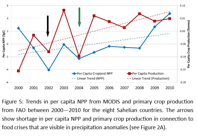 From a poster by Lund Earth Observation Group. Overall this conforms with what the data generally is saying, that Sahel for last 40 years has been on gentle improvement trend in terms of climate, after the very bad 1970s, and with normal variation that sometimes results in very serious droughts and consequent suffering, but as has been known since Biblical myth-times, virtually all of the human suffering in the Sahel is human caused, not climate caused. If there were open borders people would have left for a better climate, obviously… no farmer chooses to farm in a terrible place for agriculture… but borders are not open, people cannot move the the fertile soils of Iowa, and they are stuck there. The resulting excess suffering is caused by misgovernance, not by a climate god angered because not enough people are purchasing Prius’s. Plenty of bad things are likely and likely will happen because of human-induced climate change, there is no need to add the unfortunate woes of the Sahel to the list, for which at present there is little evidence.
