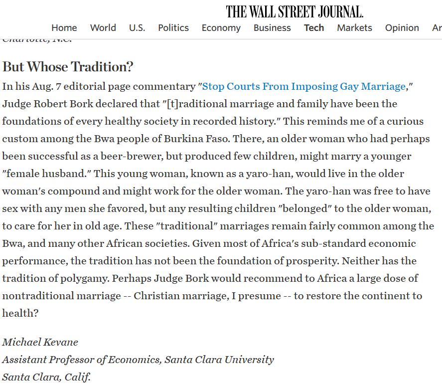 Leslie and I always remember a wonderful ethnography Nisa, by Marjorie Shostak, from the Kalahari, where women routinely called each other “Big Vagina!” I wonder if Roberts also likes that social grace? If Roberts did read and understand Nisa, a standard introductory anthropology book, I do not see how he could have written that sentence. More generally, citing anthropology and history, picking and choosing… well, one wonders who does he think he is, anyway? And he appears not to appreciate the irony that one could substitute slavery for marriage and the sentence would remain quite intact. Well, who do we think we are? Abraham Lincoln, is who we aspire to be.