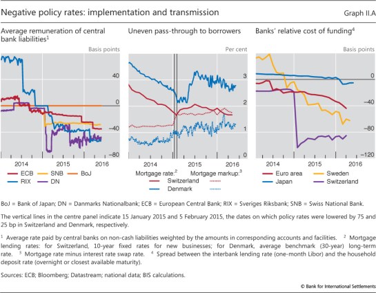 In all jurisdictions, banks, motivated by deposit withdrawal concerns, have been reluctant to pass negative rates through to retail depositors. Partly to limit the resulting impact on their net interest margins, some central banks introduced exemption thresholds for negative remuneration, thereby limiting banks’ average cost of holding central bank liabilities (Graph II.A, left-hand panel). Initially, there was also uncertainty as to how banks would treat their “wholesale” depositors, but some banks are now passing on the costs in the form of negative wholesale deposit rates. In some cases, banks have used exemption thresholds akin to those that central banks have applied to their reserves. In Switzerland, banks adjusted selected lending rates, notably mortgage rates, upwards, even as the policy rate was lowered to -75 bp (Graph II.A, centre panel). The Swiss experience suggests that banks’ ability to cope with the relatively high cost of retail deposit funding (Graph II.A, right-hand panel) without increasing lending rates will affect the technical room to keep interest rates in negative territory. This ability depends, among other factors, on the degree of competition in the banking sector and the share of retail deposits in banks’ funding mix (Chapter VI). In Denmark, where mortgage loans are mainly financed with pass-through bonds rather than deposits, mortgage rates fell alongside money market rates, although mortgage markups edged up throughout 2015 (Graph II.A, centre panel). Yet, as most Danish mortgages have adjustable rates, there was uncertainty about the tax treatment and the mechanics of dealing with negative mortgage bond coupons. Also, some investors, notably insurers, were unwilling or unable to buy negative cash flow securities, creating a demand for instruments with interest payments floored at zero. So far, negative policy rates have not led to an abnormal jump in the demand for cash. However, anecdotal evidence suggests that both financial and non-financial firms have started adapting to the new environment and are seeking to adopt innovations that would reduce the costs associated with physical currency use.